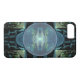 Capa de telefone com "Distrito 13", por Susan Wallace. Copyright © 2009, Susan Wallace. Uma esfera azul brilhante é cercada por formas geométricas brilhantes em tons de azul e verde neste design futurista.
