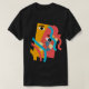 T-shirt abstrato e colorida, apresenta um design facial moderno e matizes vibrantes, amarelas, vermelhas e azuis, criando um olhar ousado e artístico que se destaca.