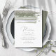Uma pintura trava aquarela em tons cintilantes de verde-oliva com salpicos de lavanda acentua as peças desta bela suíte de casamento. O cartão 'Menu' do casamento mostrado aqui também apresenta elegante caligrafia manuscrita e muito espaço para o seu texto. Adicione facilmente seus próprios nomes, data de casamento e seleções de menu usando a modelo fornecida. Procure ID886 para ver outras peças e opções de cores para este conjunto.