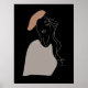 design único, mínimo e abstrato apresenta linhas brancas e manchas de laranja e branco em um fundo preto. ele pode descrever uma mulher elegante com um belo chapéu. este poster pode espalhar sentimentos de confiança e beleza para o seu espaço e também para si mesmo. Compre o seu hoje!