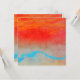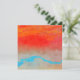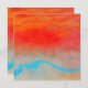 Um design abstrato de um pôr do sol oceânico com cores ousadas em vermelho, laranja, ciano, azul e bege.