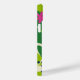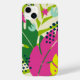 Design ilustra folhas tropicais e abstrato em cores brilhantes.