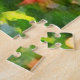 Este quebra-cabeça artístico é coberto por massas de flores em todas as cores do arco-íris. Desfrute do padrão de abstrato floral amarelo, laranja, rosa, vermelho, azul, roxo e branco sobre um fundo de folhas verdes. Ao ver isso, lembra-se uma pintura impressionista francesa.