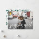 Envie cartões de natal para amigos e família em estilo chic com nossos cartões com fotos elegantes. Sua foto favorita está sobreposta com a saudação de Natal francesa "joyeux noel" em tipografia desenhada com a mão branca, com seus nomes e o ano abaixo. Cartões revertem para nosso padrão de Abundância de inverno de folhagem botânica verde-esfarelada em um fundo branco nítido.
