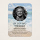 Belo funeral/memorial de fotos em aquarela/cartões de oração apresentando uma foto sobre um fundo litorâneo de ondas oceânicas indo em direção a uma praia arenosa.