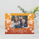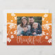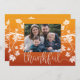 A palavra, graças escrita em lindas caligrafias. Cartões com fotos de Ação de Graças com árvores elegantes do outono e folhas de silhueta sobre fundo de gradiente colorido do outono. Personalize com sua foto favorita da família.
