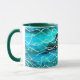 Uma caneca branca da boa qualidade com uma borda e um punho verdes escuro, decorados com um design vibrante, pintado à mão, do abstrato que sugere ondas em azul, em verde, a turquesa e o branco.