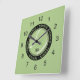 O relógio do templo do esporte impresso em verde com sotaques pretos com um gráfico de bola de tênis no centro. Espaço para iniciais opcionais. Sua escolha de quadrado ou redondo. Mude a cor das mãos e do fundo, se desejar. Excelente para uma criança ou um quarto de dormitório.