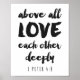 Lê "acima de tudo, amem-se profundamente, 1 Peter 4:8" em uma fonte moderna e na moda. Disponível em vários tamanhos. Solicitações de cor personalizadas bem-vindas. Mostrado: carvão vegetal