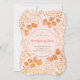 Bonito carvalho de madeira tem convite em tons de pêssego e marrom. Um quadro de bolotas, silhuetas de folhas e bagas rodeia a informação do convite.