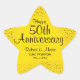 Vestido adesivo amarelo-dourado para usar para um selo de envelope de 50 anos ou selo de festa. A forma das estrelas é festiva e a foto do glitter de busto dourado espalhado pelas bordas o torna ainda mais festivo. Feliz 50º aniversário de casamento está escrito no topo. Os nomes dos casais do aniversário são escritos logo abaixo com a data do casamento e anos de casamento. Um belo toque para um dia muito especial.