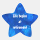 "A vida começa na reforma" adesivo em forma de estrela. MEU TRABALHO DE ARTE ORIGINAL em Zazzle.com/virginia5050 e RetirementGiftStore em www.zazzle.com/RetirementGiftStore. http://www.zazzle.com/i_love_rock_n_roll_postage-172730376948638463