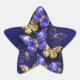 Composição de borboletas luxuosas de safira e joias de ouro em fundo azul texturizado.