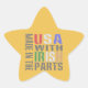 Leituras, em caracteres viscosos, FEITAS NOS EUA COM PARTES IRLANDESAS. Os EUA mostram em letras vermelhas, brancas e azuis. O irlandês aparece em verde, branco e laranja. A cor de fundo neste adesivo de estrela é o ouro amarelo. Você pode mudar para qualquer cor que quiser. A tia Calçado escolheu-o para ir com a forma estelar do adesivo. Maneira divertida de compartilhar sua herança, culturas e ancestrais. Quer mudanças? Tente o link PERSONALIZAR. Adicione um nome ou qualquer coisa que você desejar ao design. Ou use o link CONTACT THE DESIGNER para perguntar à tia Calçado o que fazer.