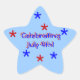 O texto em vermelho, branco e azul diz "Celebrando 4 de julho!" As estrelas vermelhas e azuis flutuam em fundo azul. Use para decorar convites de festas, cartazes, cartões de nome, etc. para sua comemoração.