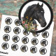 Adesivos de cavalo preto. Flores silvestres crescem perto da cabeça de um belo cavalo preto. Ele tem um pequeno pedaço de branco no rosto, mas tudo o mais é preto. O adesivo é branco com uma borda preta e cinza. Adesivos redondos vêm em dois tamanhos.