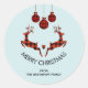 Os adesivos personalizados com um nome e também dizem "Feliz Natal" em texto curvo. Projetado com uma ilustração de 2 cervos de Natal saltando. Os cervejeiros são feitos de xadrez vermelha e preta, com um pouco de coração entre eles. As decorações de natal de xadrez vermelha e preta penduram no topo. Fundo azul claro.
