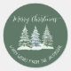 Essas etiquetas de feriado coloridas em verde sálvia são perfeitas como selos de envelope ou etiquetas de presente. Elas apresentam um design rústico em aquarela com três árvores de pinheiro, abeto ou pinheiro nevadas e letras em caligrafia elegante que diz: Feliz Natal! Há espaço para um bilhete ou mensagem curta abaixo. Otimizado para etiquetas em forma redonda.