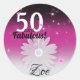 #50 ou Cinquenta e Fabuloso! Celebre com design gráfico original preto, rosa e branco divertido. A margarida rosa pálida com o centro falso brilha se destaca contra o fundo mole ombre. Os sotaques de estrelas brancas e cor-de-rosa brilham no fundo deste design gráfico original. Texto branco 50 com tipografia roxa e preta cursiva "fabulosa". Personalize o evento com o nome da garota de aniversário!