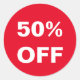 50% de adesivos desligados para promoções de vendas de loja. Etiquetas de desconto de promocional redondo e brilhante personalizáveis para empresas. Adicione seu próprio valor percentual personalizado e cores de fundo. materiais de marketing DIY para compras, empresa de varejo, pontos de venda, eventos, negócios especiais, correspondência promocional, descontadores, etc. Exemplo de metade do preço vermelho e branco. Também útil como selos de envelopes.