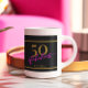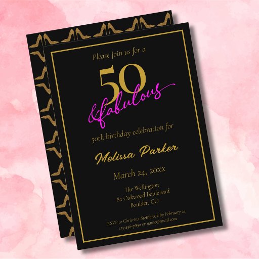 Mande convites para a sua 50ª festa de aniversário em estilo com este adesivo chic "50 e fabuloso"! Apresentando texto dourado e realces sobre fundo preto, com um traço de elegante roteiro rosa-quente.