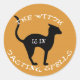 "A bruxa está lançando feitiços" em texto branco ao redor de um gato preto sobre um fundo laranja texturizado.