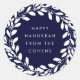 Estas etiquetas felizes simples e elegantes de Hanukkah caracterizam uma grinalda da folha branca na moda e saem-na, com o texto branco moderno em uma obscuridade, fundo dos azuis marinhos.