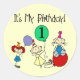 A figura meninas de três varas em chapéus do partido com balões, em um com um número 1 nela, e no texto do estilo do miúdo que a lê "é meu aniversário!" é caracterizado em primeiros t-shirt do aniversário, creepers, ímãs, cartões, sacolas, e mais.