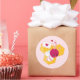 Um adesivo com uma doce imagem de uma abelha-mãozinha, riscada, rosa e branca. Um pedaço de pente de mel amarelo atrás. Uma carta selada com coração e um grupo de corações flutuantes também fazem parte do design.