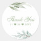 Agradecimento Floral de Greenery de Aquarela Rústica Adesivo Redondo Clássico. Este design botânico simples e elegante apresenta folhas em estilo de eucalipto em tons de verde e branco.