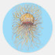Uma água-viva surpreendente é representada com uma geleia fluida e colorida. As intrincadas linhas em azuis e laranjas vibrantes dão uma sensação de movimento e graça. Essa imagem captura a delicada beleza da vida marinha com um talento artístico.
