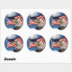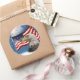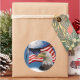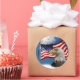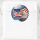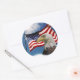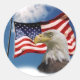 Mostrada é uma imagem da bandeira dos EUA e um perfil orgulhoso de uma águia careca.