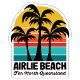 Um design de pôr do sol ousado, inspirado na vintagem, celebrando Airlie Beach, na região de Whitsunday de Queensland, Austrália. Este design em forma de arco apresenta uma silhueta impressionante de uma palmeira exuberante.