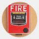 Fotografia de uma alça vermelha de alarme de incêndio montada numa parede de madeira