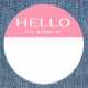 Um adesivo circular redondo com o tradicional texto "Olá, meu nome é" sobre cor de fundo rosa para menina, excelente para revelação de gênero ou eventos de chá de fraldas.