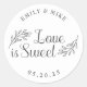 Os adesivos de casamento personalizados que trazem elementos de licença botânica e "Love is Sweet" em uma elegante escrita manual. Personalize com os nomes do casal/noiva e noivo e a data do casamento.