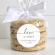 Um adesivo branco chic para os favores do seu casamento com "o amor é doce" em letras simples modernas e um roteiro elegante com sucos, seus primeiros nomes unidos por um coração e sua data de casamento.
