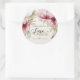 Um belo adesivo de casamento personalizado com uma escritura de citação inspiradora retrata uma elegante primavera e uma cor d'água floral do jardim botânico de verão com simples flores cor-de-rosa e verde. Apresenta os nomes dos casais e uma parte da Bíblia Verse 1 Corinthians 13:8, "O amor nunca falha."