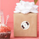 Estes elegantes e vírgulas adesivos de casamento exibem rosas vermelhas profundas com folhagem e folhas verdes, em volta de uma borda de círculos dourados falsos, em um fundo branco.