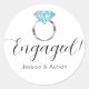 Essas adesivos personalizados dizem Engajado! junto com um anel de noivado de diamante azul com faixa de prata e os nomes dos noivos na parte inferior. Perfeito para uma festa de noivado ou anúncio de save the date!