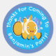 Este feliz peixe-palhaço está se divertindo em sua casa de nome. Perfeito para bolsas partidárias. Desenhado em estilo de desenho animado para uma diversão sob a festa de aniversário do mar!