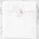 Aniversário do Clássico Redondo com um adorável unicórnio com asas, que está rodeado por lindas imagens de um castelo mágico, nuvens e beliche festivo.