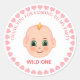 Aniversário de criança bonito Obrigado com o rosto do bebê e corações cor-de-rosa Sticker. O texto pode ser personalizado para crianças aniversários, chás de fraldas, anúncios e muito mais.