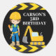 obrigado de festa de aniversário de veículos de construção legal e personalizada para uma criança que adora escavadora de construção amarela em preto e amarelo. Design de veículo divertido para um menino que ama carros e caminhões. Personalize com o nome do seu filho sob a fita de precaução preta e amarela para bolsas partidárias.