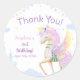 Aniversário do Clássico Redondo com um adorável unicórnio com asas, que está rodeado por lindas imagens de um castelo mágico, nuvens e beliche festivo.