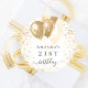 Para um aniversário elegante de 21 ruas (ou qualquer idade). Uma cor branca de fundo. Decorado com faíscas de brilho dourado e balões de ouro. Personalize e adicione um nome e idade. A palavra aniversário é escrita com um moderno estilo escrito à mão com traços.