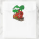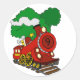 Um belo trem de desenho animado com o número 9 na frente e fumaça vindo da pilha e das árvores ao fundo.