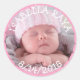 Etiquetas de fotos de bebês com nome e data de nascimento.