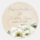 Esta etiqueta de adesivo floral romântico em estilo vintage apresenta um design de papel pergaminho rústico que se assemelha a um livro antigo, com flores de ranúnculo em aquarela. Um delicado buquê de ranúnculo e folhagens é retratado na parte inferior. Os nomes de um casal recém-casado e a data do casamento são impressos acima. Você pode personalizar os adesivos para incluir seus próprios nomes ou texto personalizado.