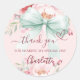 Um fundo rosa delicado, decorado com um grande arco verde-menta e flores rosa. Texto: Obrigada por compartilhar meu dia especial. Com um pequeno coração. Personalize e adicione seu nome.
